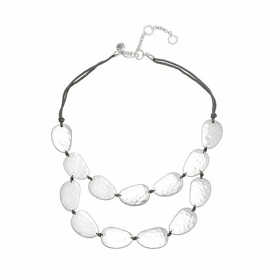 This Bella Uno two-row necklace features worn metal discs for a stylish look you’re sure to love!